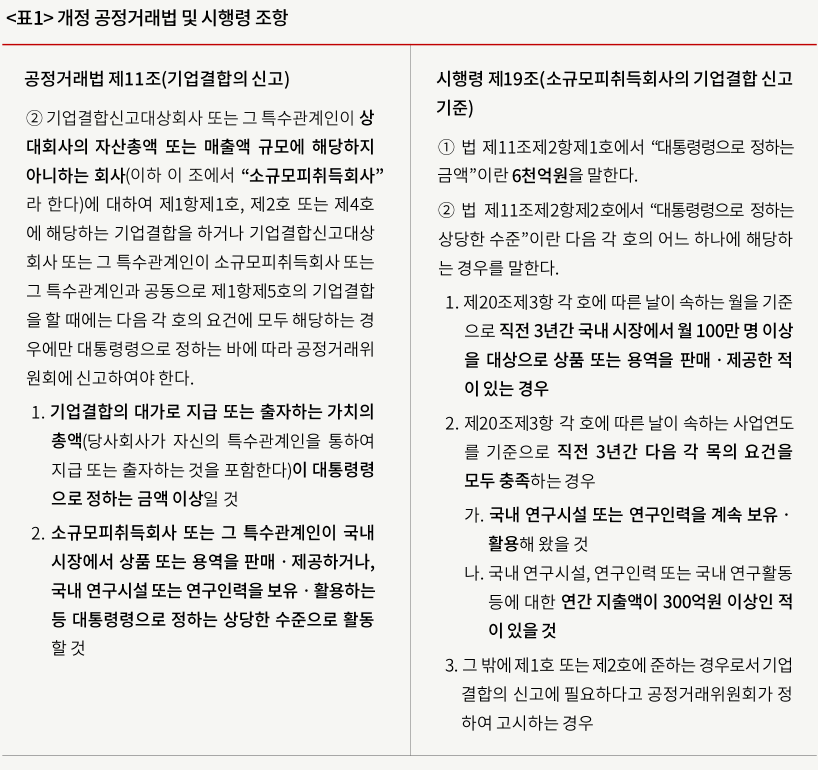 개정 공정거래법(2021. 12. 30. 시행)은 소규모 피취득회사의 기업결합 신고의무를 다음과 같이 정하고 있습니다. ① 기업결합의 대가로 지급ㆍ출자하는 가치의 총액이 6,000억 원 이상이고 ② (i) 피취득회사가 직전 3년간 국내 시장에서 월 100만 명 이상을 대상으로 상품 또는 용역을 판매ㆍ제공한 적이 있는 경우 또는 (ii) 피취득회사가 직전 3년간 국내 연구시설 또는 연구인력을 계속 보유ㆍ활용해왔고 그 연구활동 등에 따른 연간지출액이 300억 원 이상인 적이 있는 경우 등은 기업결합 신고의무가 발생합니다. 즉, 거래금액이 크고 국내활동이 시장경쟁에 유의미한 영향을 미칠 정도로 상당한 경우를 의미합니다.