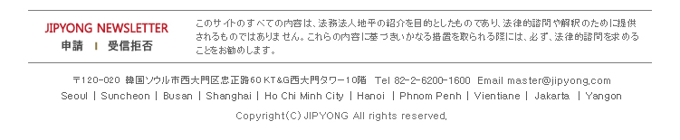 〒04527 韓国ソウル市中区世宗大路14 グランドセントラルA棟26階 TEL +82-2-6200-1600 FAX +82-2-6200-0800 © JIPYONG LLC. ALL RIGHTS RESERVED. |