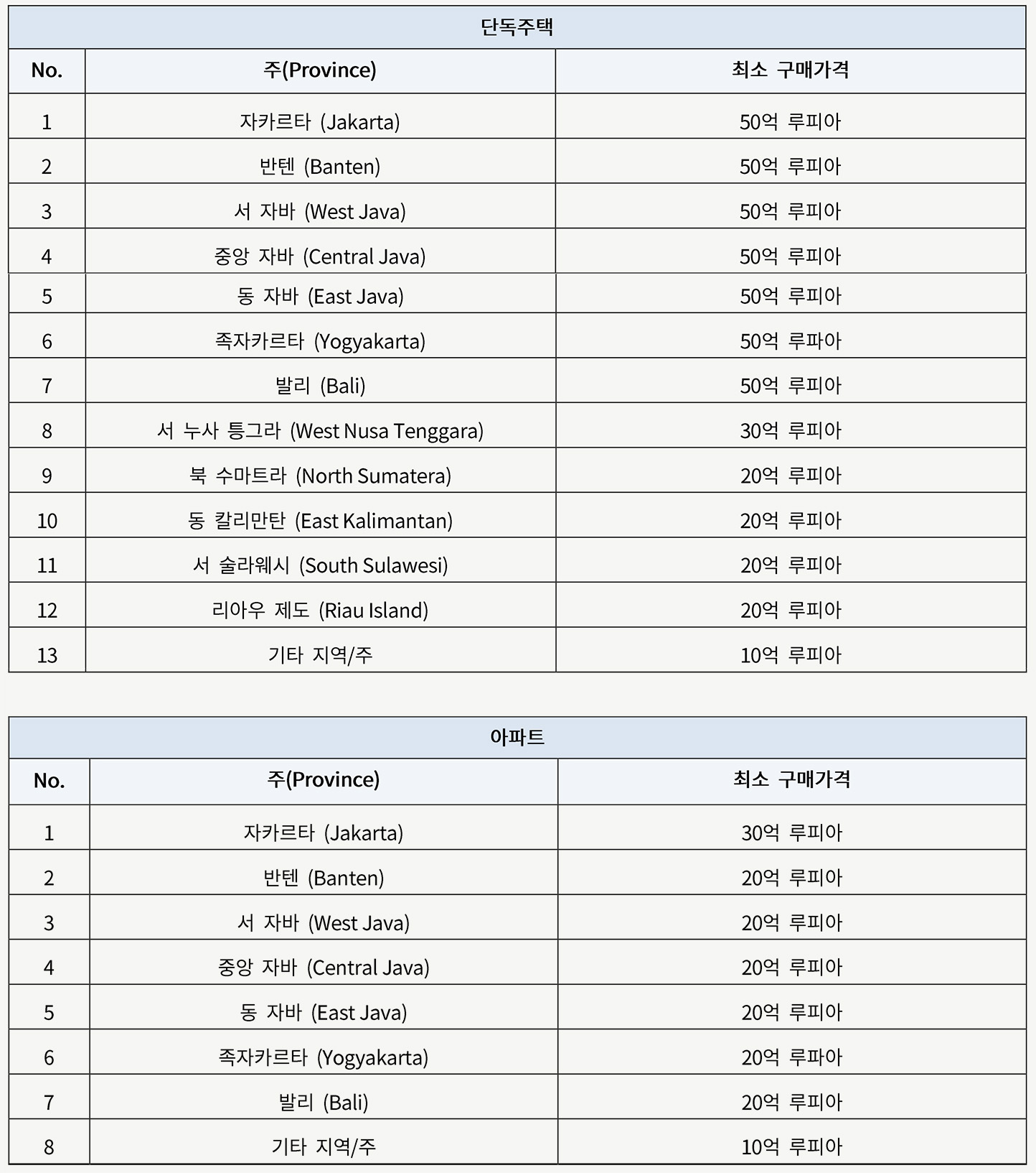 외국인이 구매 가능한 자카르타 소재 아파트의 경우 최소30억 루피아, 자카르타 소재 단독주택의 경우 최소 50억 루피아로 명시하고 있으며, 후속 시행규칙에서 규정하고 있는 기타 인도네시아 내 다른 주(Province)에 위치한 주거용 부동산의 최소 구매가격은 아래와 같습니다.