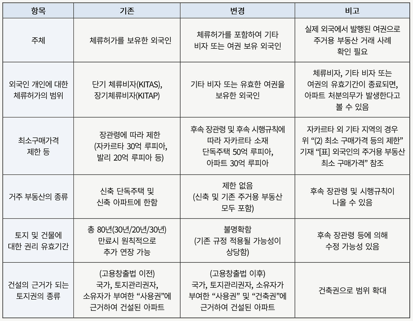 2. 후속 장관령 및 시행규칙 등에 따른 외국인의 주거용 부동산 소유권 제도 변경 내역