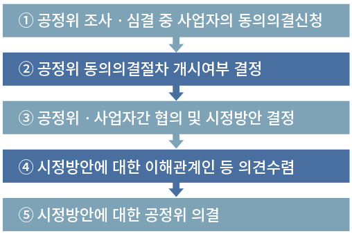 이와 같이 이해관계인 등의 의견수렴 과정이 끝난 시정방안은 공정거래위원회 전원회의 또는 소회의에 상정되게 되고, 이후 시정방안을 심의ㆍ의결을 거쳐 동의의결을 하게 됩니다(⑤). 만약 각 회의에서 시정방안이 승인되지 않을 경우 통상의 시정조치 절차가 재개됩니다.